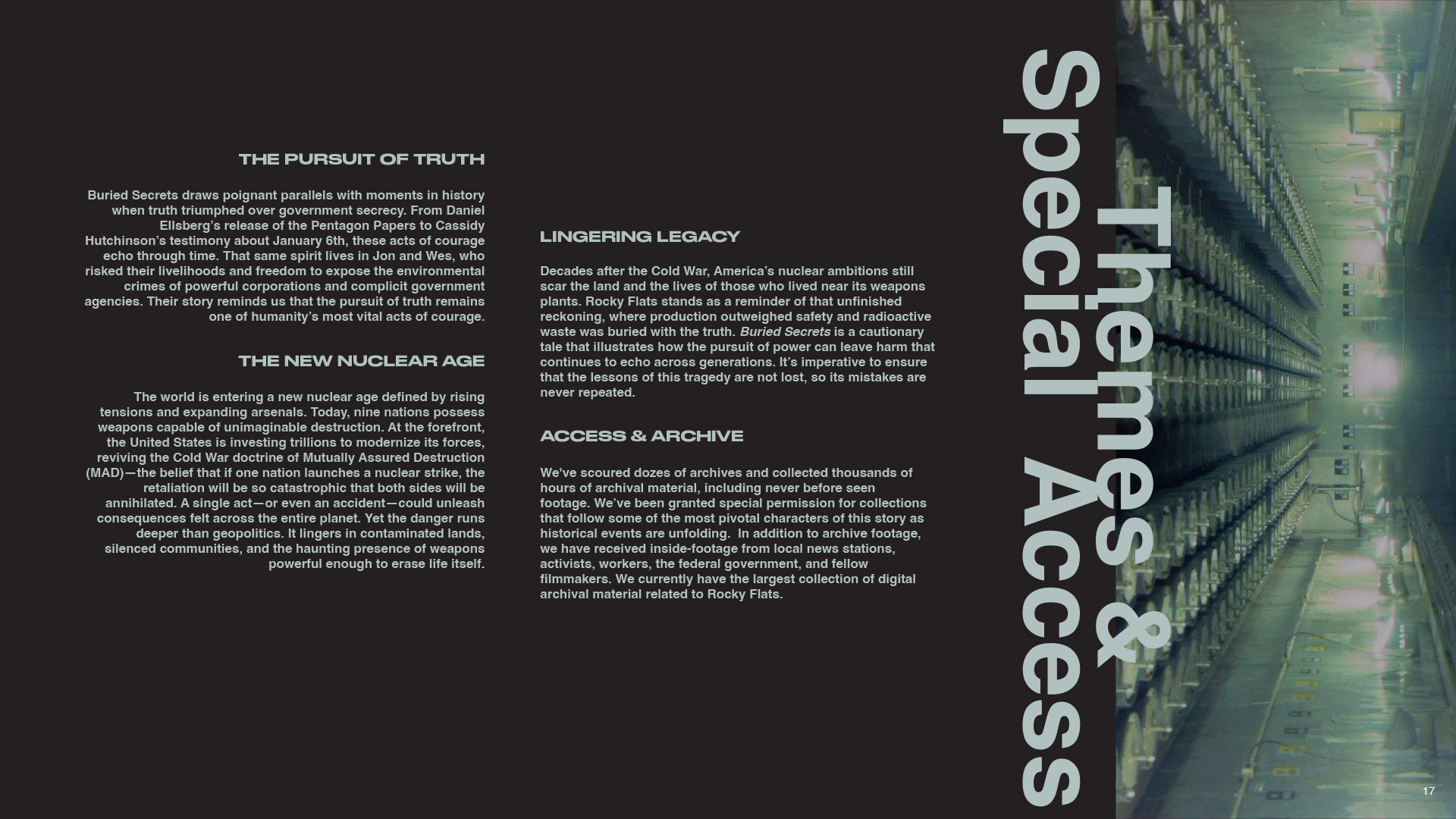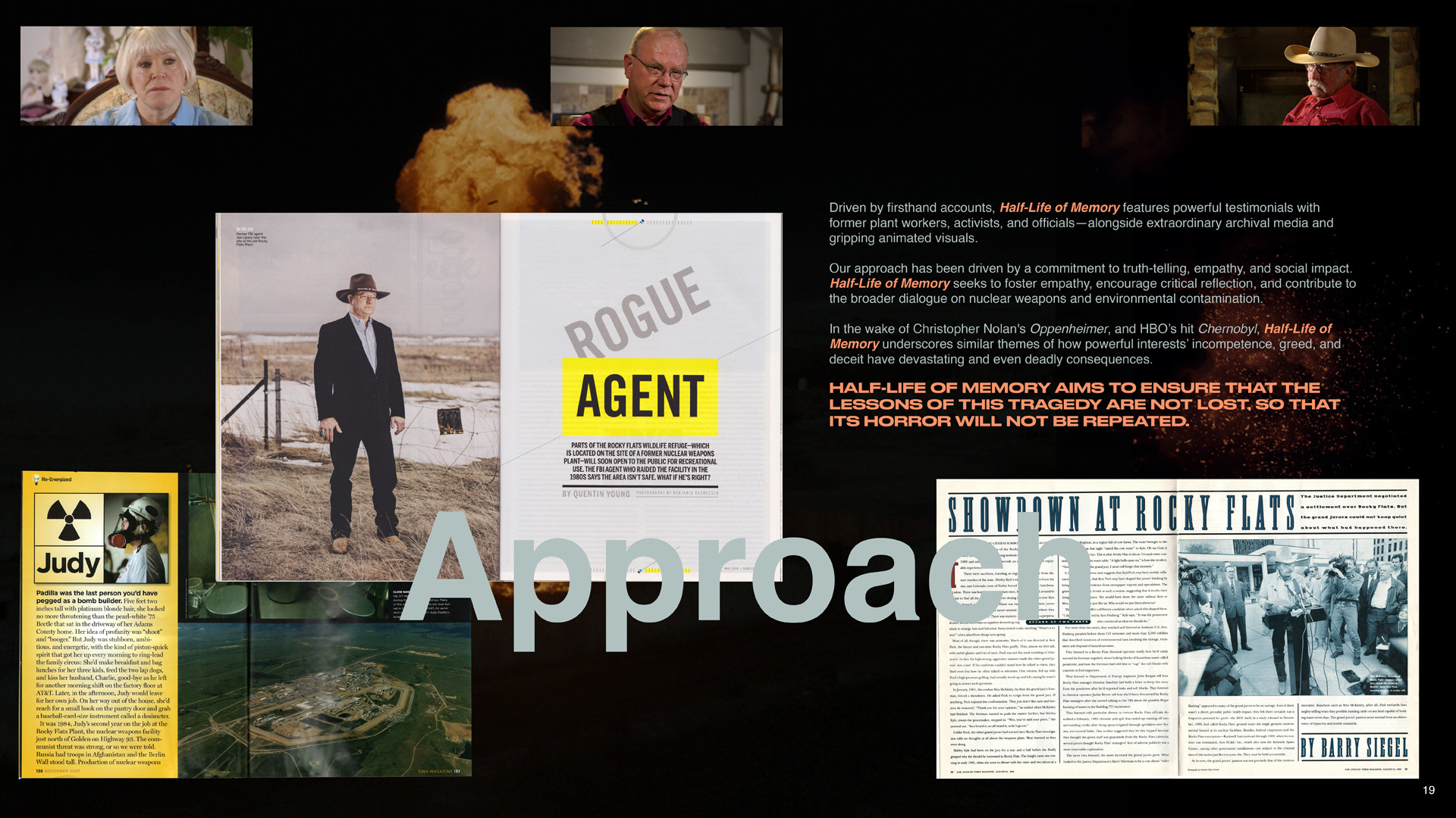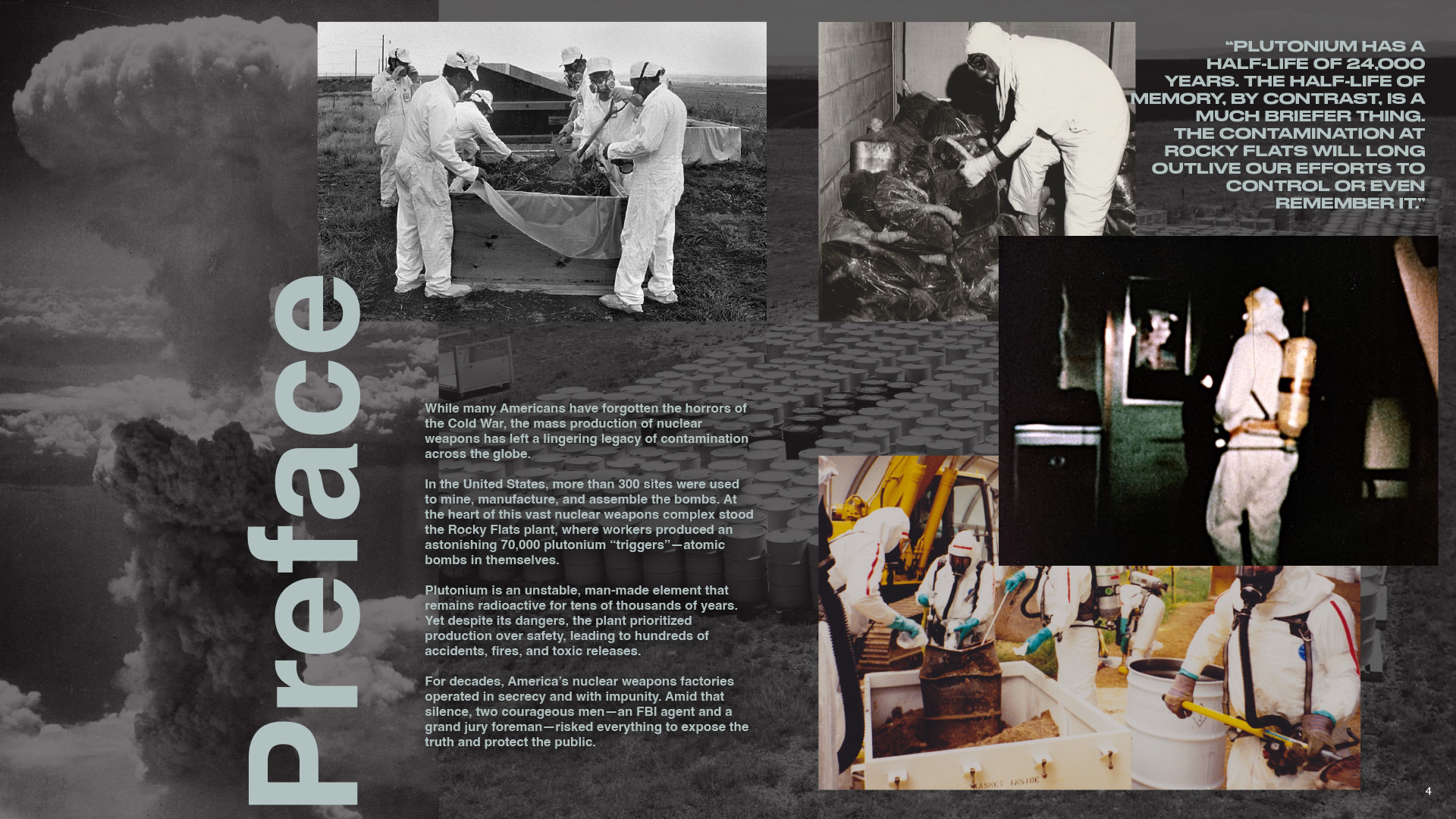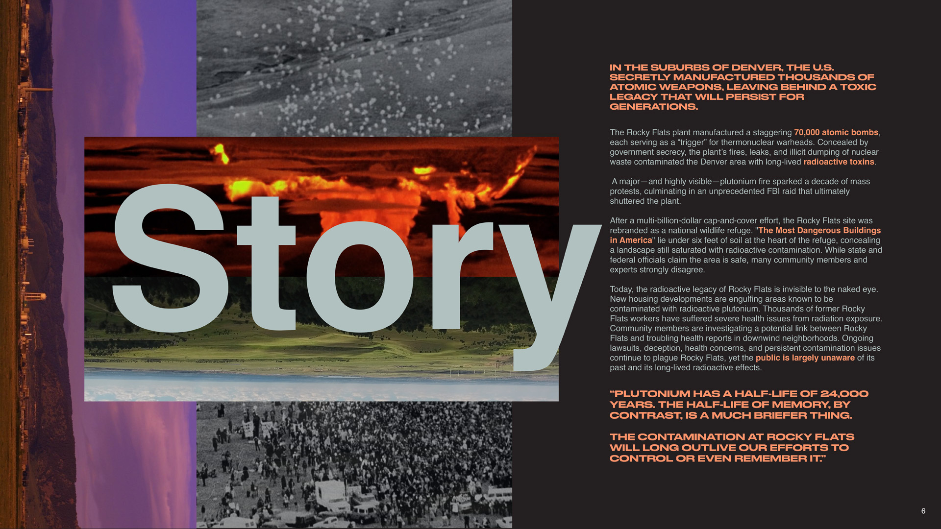 Through powerful testimonials and extraordinary archival media, Half-Life Productions exposes Rocky Flats' dark past and prompts critical reflection on the implications of the nation's renewed nuclear weapons buildup.