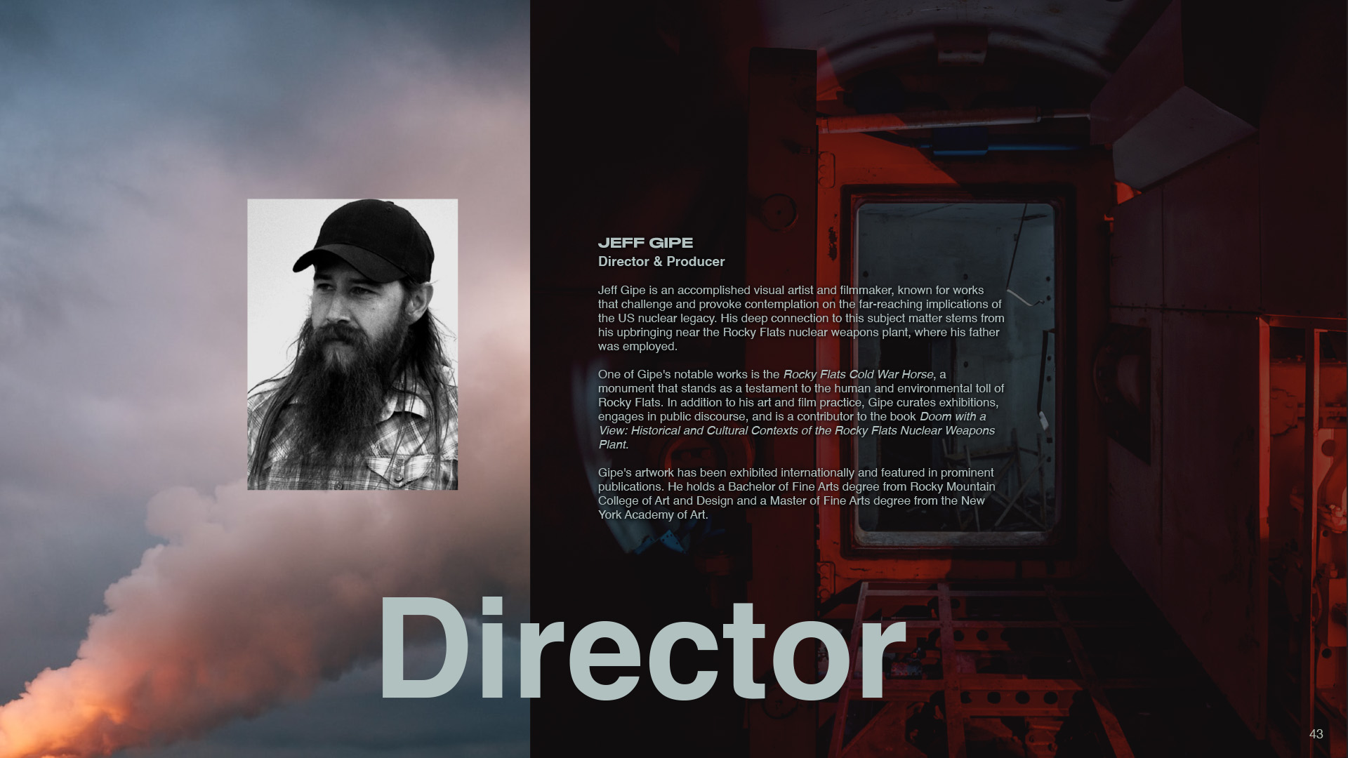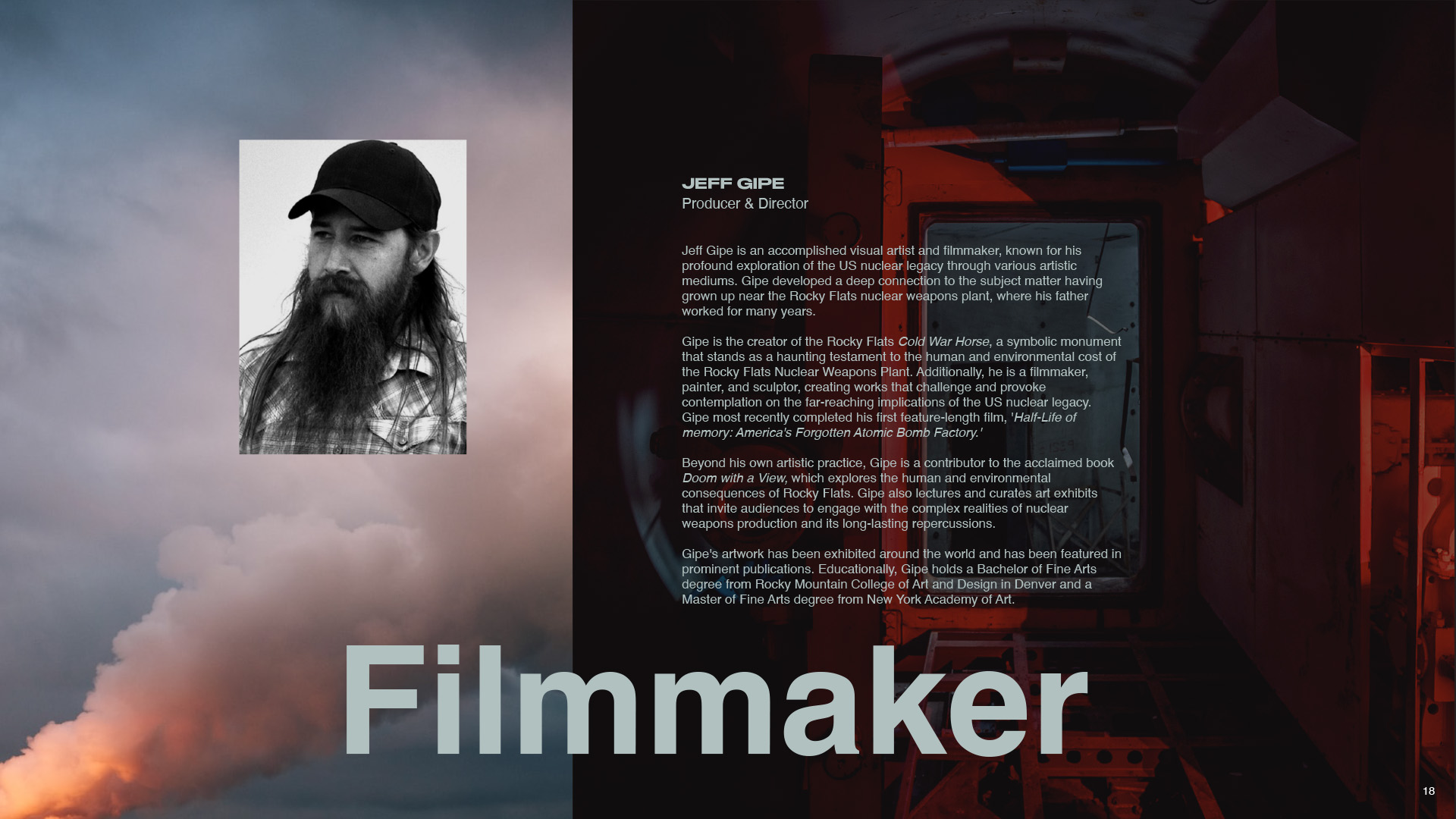 Jeff Gipe is a visual artist and filmmaker whose works delve into the far-reaching implications of the US nuclear legacy. His deep connection to this subject matter stems from his upbringing near the Rocky Flats nuclear weapons plant, where his father was employed. He is the director of Half-Life of Memory, the creator of the Rocky Flats Cold War Horse monument, and a contributor to the book Doom With A View.